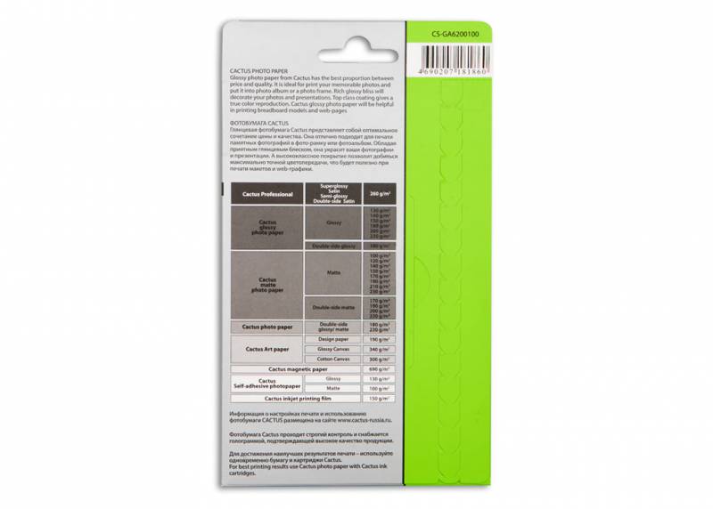 Бумага,Cactus CS-GA6200100, 10x15,200г/м2,100л., глянцевая для струйной печати