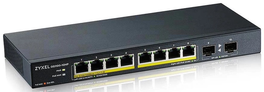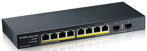 Коммутатор PoE+ Zyxel GS1100-10HP, 8xGE PoE+, 2xSFP, настольный, бесшумный, бюджет PoE 130 Вт, Kensigton lock